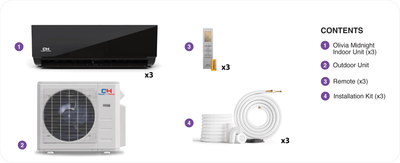 3 Zone 36,000 BTU Olivia Midnight Ductless Mini Split AC Wall Mounted 12K+12K+12K